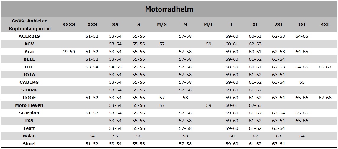 *Eine Beschreibung der Motorradhelmtypen finden Sie am Ende dieser Seite.